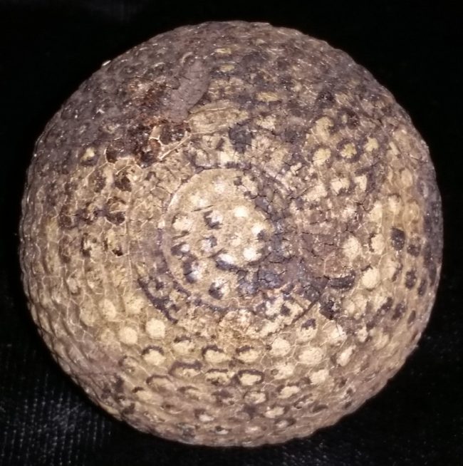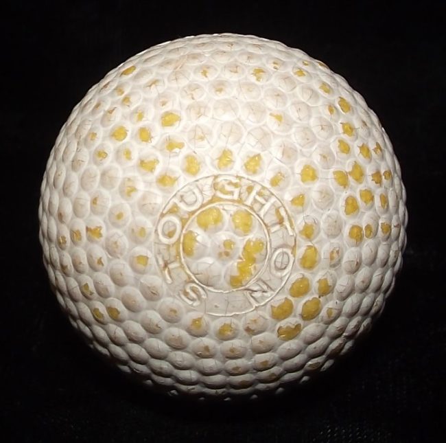 Object Name: Ball, Golf Other Name: Ball Date: ca early 1900’s Description: Golf ball in bramble pattern. There are markings on two sides of the ball, but they are illegible. Maker: unknown Material: probably gutta percha Dimension Details: 1.68″ (diameter) Marks/Inscriptions: illegible Object ID: B 199