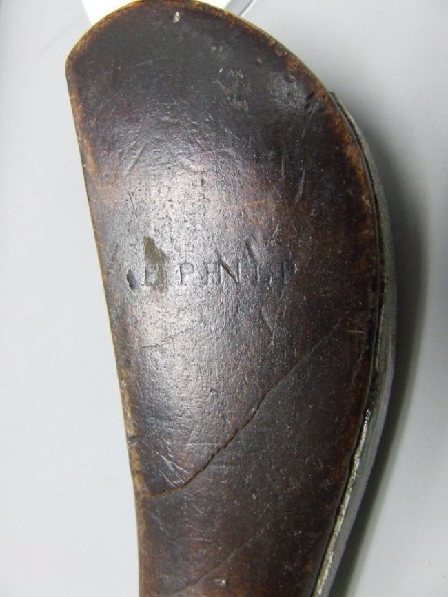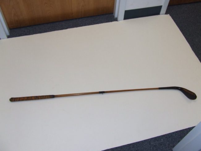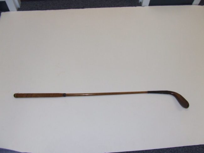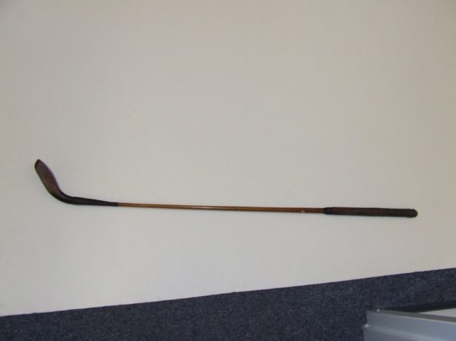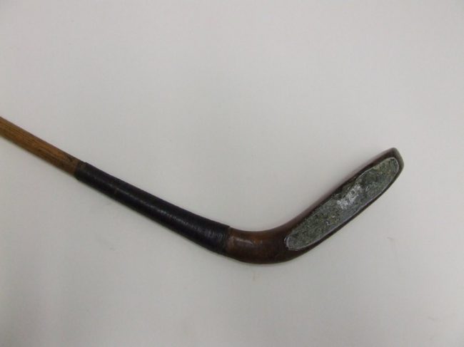 Object Name: Club, Golf Other Name: CLUB, METAL, WOOD SHAFT Date: 1845—1906 Year Range from: 1845 Year Range to: 1906 Description: Wood shaft and iron clubhead. Replacement shaft and leather grip. Maker’s mark and shaft stamp. Maker: WILSON, R Material: wood, leather, iron Dimension Details: Overall: 39 3/4″ grip: 13 1/8″; clubhead: 7 7/8″ (hosel…