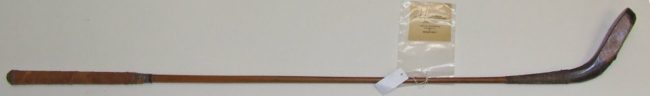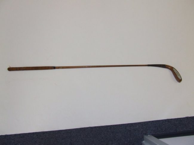 Object Name: Club, Golf Other Name: CLUB, WOOD, WOOD SHAFT Date: 1860—70 Year Range from: 1860 Year Range to: 1870 Description: Wooden club with scared neck, leather grip and spliced clubhead with backweight and horn insert. Black finish on clubhead. Maker’s stamp. Maker: McEWAN Material: wood, leather, horn, lead Dimension Details: Overall:43 1/4″; grip: 11…