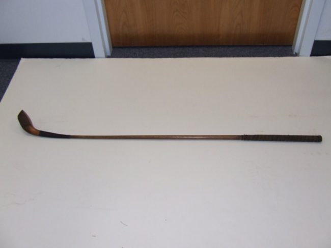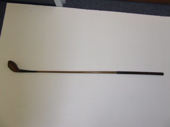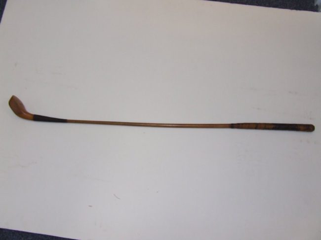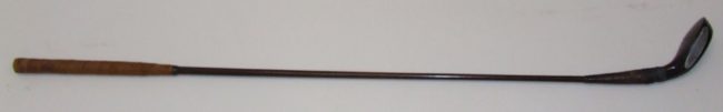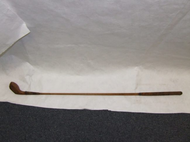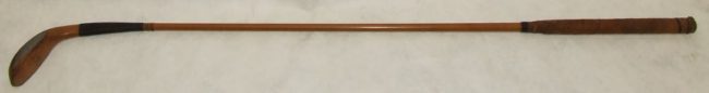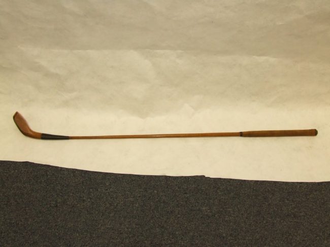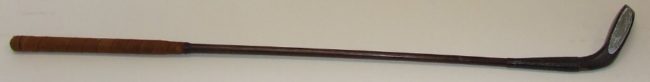 Object Name: Club, Golf Other Name: CLUB, WOOD, WOOD SHAFT Date: 1901—1908 Year Range from: 1901 Year Range to: 1908 Description: Leather grip, hickory shaft, dark stained clubhead, no shaft stamp, crown maker’s mark, scared neck, backweight, brass sole plate, horn insert, horizontally scored face. Maker: FORGAN, ROBERT Dimension Details: Overall: 44 1/4″; grip: 10…