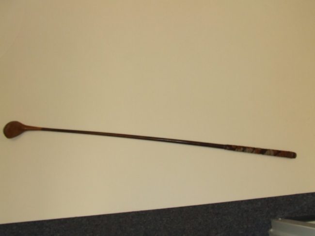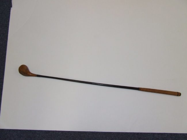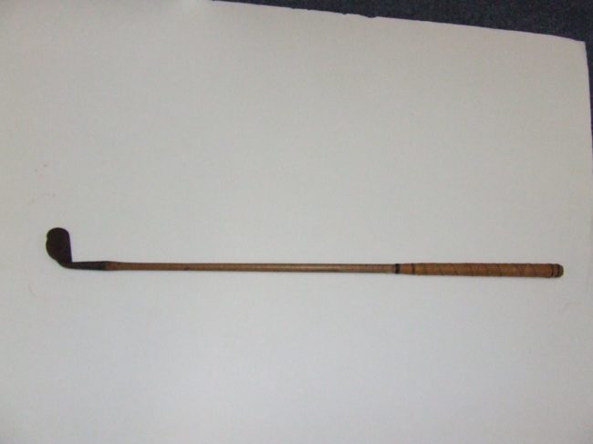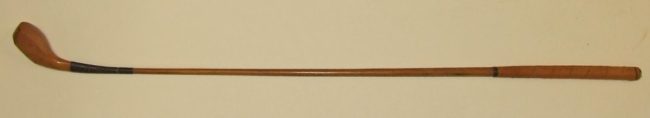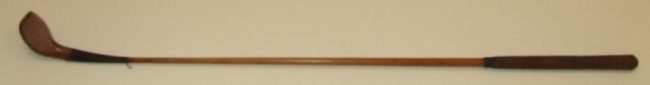 Object Name: Club, Golf Other Name: CLUB, METAL, WOOD SHAFT Date: 1900 Description: Sheepskin grip, unvarnished wood shaft, metal blade. Shaft stamp and maker’s mark. Smooth face. Maker: SPALDING, A.G. & BROS. Material: metal, leather, wood Dimension Details: Overall: 39″; grip: 12 3/8″; blade: 5 1/4″ (toe to hosel), 3″ x 1 5/8″ x 1/2″…