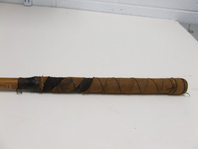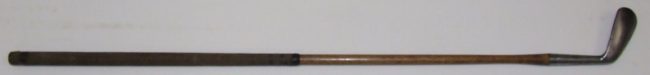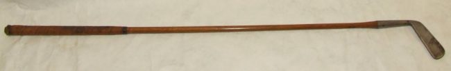 Object Name: Club, Golf Other Name: CLUB, WOOD, WOOD SHAFT Date: 1820—1830 Year Range from: 1820 Year Range to: 1830 Description: Leather grip, natural hickory shaft and dark clubhead. Spooned face. Repaired at toe. Horn insert and backweight. Possibly altered horn insert. Repair to toe area of face. Marks where shaft stamp may have been…